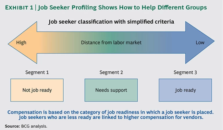 For example, the government in Saudi Arabia uses information on factors such as job history, education, and marketable skills to place job seekers into three categories: green for those who can likely be placed in a job quickly, yellow for those who need a bit more support to find work, and red for those who will need significant training or support to be placed. And in Australia, unemployed workers seeking government support are segmented according to the government’s Job Seeker Classification Instrument, a tool that considers age, occupation, employment history, and other factors. That segmentation is used to determine job readiness, and private-sector employment-service providers are paid on the basis of the level of difficulty associated with finding employment for the different segments.