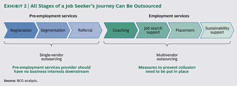Although countries have different philosophies about which portions of the job search journey should be handled by the private sector, it is possible to outsource each step in that process. (See Exhibit 2.) However, outsourcing has to be carefully managed to ensure fair competition. For example, if the government plans to outsource across the entire process, the earlier stages of the journey, up to the referral to the specific service center, are best managed by a single provider that has no role in actually providing services. This ensures that both easy- and difficult-to-place job seekers are distributed across available vendors without bias.