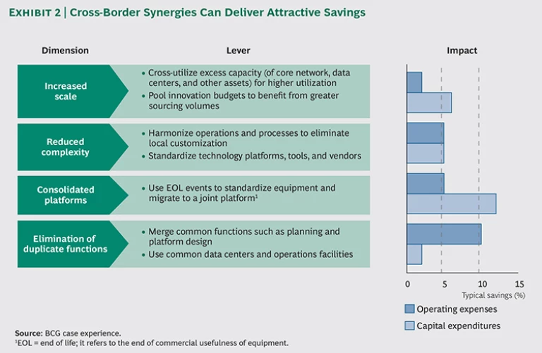 Building on the lessons of the past and the technologies of today, we have developed a fresh approach to cross-border synergies, one that can bring telecom operators annual capital-expenditure, or capex, savings of 3 percent or more—and a 15 percent improvement in free cash flow after five years. Indeed, the benefits—increased scale, reduced complexity, consolidated platforms, and elimination of duplicate functions—are almost equally distributed across operating-expense and capex domains. (See Exhibit 2.) A cross-border platform can even boost shareholder value by increasing profitability at the group level.