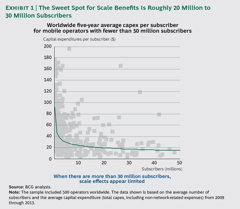 Many network-technology costs are largely independent of operator size: the more subscribers a telco has, the more it can spread costs around. To get the optimal scale dividend, however, telcos need a lot of subscribers. Our analysis of the sweet spot for realizing cost benefits puts the number at roughly 20 million to 30 million subscribers. (See Exhibit 1.) However, most national markets—particularly those in Europe, the Middle East, and Africa—are just too small to support such numbers. Indeed, in many countries, even the market leader has fewer than 5 million subscribers. Yet for a telco with an international footprint, 20 million to 30 million is a subscriber level that might be attainable once the telco looks beyond its national borders.