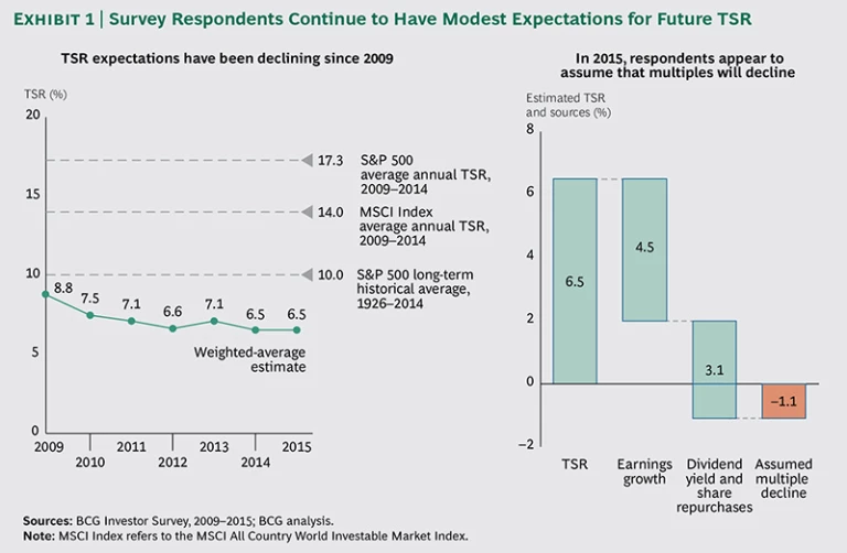 Despite the fact that equity markets have delivered double-digit returns since 2009, the respondents to our annual survey have been remarkably consistent in having quite modest expectations for future TSR. Every year, we ask investors to estimate average annual TSR over the next three years, as well as the underlying rate of earnings growth and dividend and share-repurchase yields. In 2015, the average estimate of future TSR was 6.5 percent—the exact same as in 2014. (See Exhibit 1.) Fewer than 1 in 10 respondents estimated that future TSR would be above the long-term historical average of 10 percent.