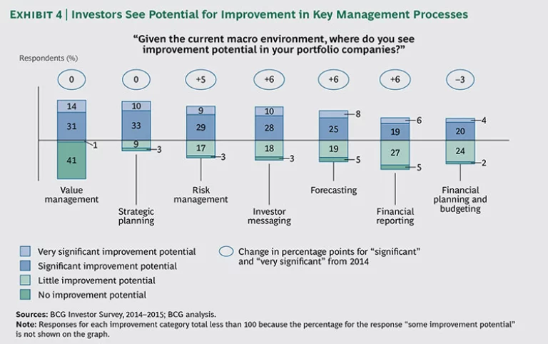 Finding the sweet spot between managing free cash flow and allocating financial capital and managerial talent in a way that continues to grow earnings and defends the valuation multiple won’t be easy. There are indications in this year’s survey that respondents are paying special attention to the quality of a company’s management processes in getting the balance right. Every year, nearly two-thirds of our respondents say that the business, financial, and investor strategies of the companies they invest in are only partly or even poorly aligned. This year was no different: 61 percent think so. Nearly half of respondents (45 percent) also said that there were either significant or very significant opportunities for improvement in value management at their portfolio companies, and 43 percent said the same for strategic planning. (See Exhibit 4.)