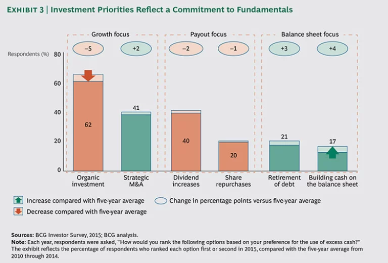 If these investors expect a market environment of modest earnings growth, gradual decline in valuation multiples, and below-average TSR, then how do they think companies should respond? One indication comes from the investors’ preferences for how companies should use their excess cash. (See Exhibit 3.) It is useful to divide the responses into three clusters. “Organic investment” remains, by far, the top priority, chosen either first or second by 62 percent of respondents. This result is somewhat below the five-year average result but still considerably ahead of other options. Next come strategic M&A (41 percent) and dividend increases (40 percent). Finally, share repurchases (20 percent), debt retirement (21 percent), and building cash on the balance sheet (17 percent) bring up the rear—although the proportion of respondents listing the final two as a top priority is 3 and 4 percentage points, respectively, above the five-year average for our survey.