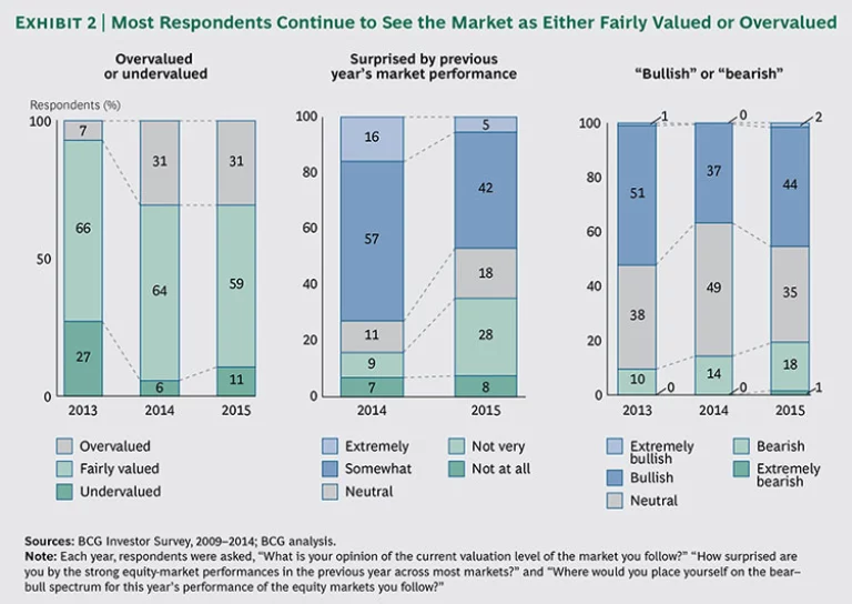 And yet, despite concerns about possible overvaluation, these investors do not seem to be anticipating a major drop in market values. Rather, they appear to be anticipating something more in the nature of a soft landing, with lower but still positive levels of TSR. Although many respondents believe that markets are near their peak, they are not particularly surprised at how well markets performed in 2014. The middle chart in Exhibit 2 shows that whereas 73 percent of respondents in 2014 were either somewhat surprised or extremely surprised by the previous year’s market performance, in 2015 that share dropped to less than half (47 percent). The expectation of a soft landing may also explain why, despite worries about overvaluation, nearly half of respondents (46 percent) are either “bullish” or “extremely bullish” about future market prospects—up from 37 percent one year ago. To a degree, this increased bullishness reflects the greater representation of investors focusing on non-U.S. equity markets in this year’s survey. Only 44 percent of investors focusing on U.S. equity markets are either bullish or extremely bullish, whereas 53 percent of investors covering Asian markets and 57 percent following European markets are. But it’s also plausible that this increased bullishness in 2015 reflects investor optimism that equity markets are finding a new equilibrium after the intense volatility in the years immediately following the 2008 financial crisis.