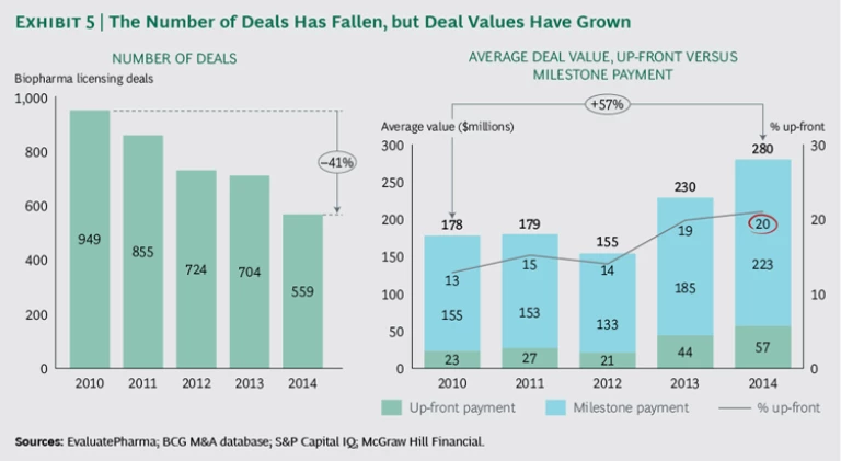 This requires both internal capabilities and high-performing business development engines. Large companies should focus their R&D in therapeutic areas and medical conditions where they can invest, build, and expand their capabilities, and they should acquire innovative products from other, often smaller biotech players once the scientific concept has been proven. Business development capabilities are a critical differentiator, and large companies need to position themselves as the partner of choice for smaller biotech companies. With many suitors vying for their products, biotech companies can extract ever-sweeter financial terms from big companies. The number of overall business development deals has fallen, but average deal value has grown because of increased competition. (See Exhibit 5.)
