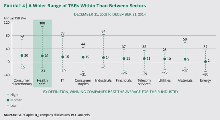 BCG analysis shows that 9% growth is necessary to achieve median S&P 500 shareholder value creation. Is it possible for biopharma and medtech companies to achieve this rate of growth (or higher) in an industry that is growing at a much slower pace? Fortunately, the average growth in a market does not determine the fate of every company. Our research shows that growth among players in a single sector varies more than average growth across sectors. (See Exhibit 4.) Similarly, the range of TSR within health care subsectors (for example, biopharma, medtech, and health care services) is wider than the range of TSR across these subsectors.