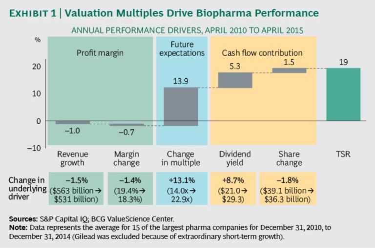Consider the top 15 biopharma companies. Between 2010 and 2015, they collectively generated a TSR of 19% per year—more than doubling their investors’ money in four years. (See Exhibit 1.) This creation of wealth took place despite negative growth (the growth rate of these 15 companies actually declined by 1.5%). There are several explanations for the sector’s strong market performance. Companies were able to mitigate the impact of patent cliffs better than expected, to rationalize their cost base in order to address eroding operating margins, and to redistribute cash through predictable and growing dividends and massive common-stock repurchases. In addition, many management teams consolidated smaller players or acquired products to cut costs and offset revenue lost to generics.