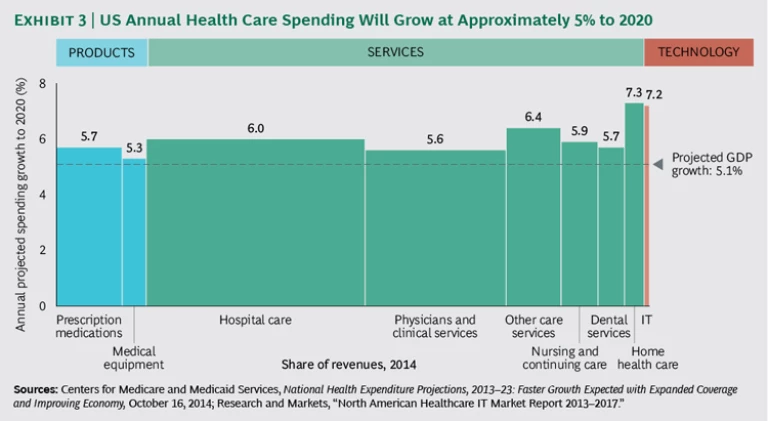 Today, market dynamics have changed dramatically. Public and private payers worldwide have become more proactive and powerful, and they are actively attempting to control spending and reduce health care costs. They are putting downward pressure on both pricing and volume for biopharma and medtech companies. Over the past five years, single-payer systems in the EU5 have contained health care expenditures at a compound annual growth rate of 1.9%. And the Centers for Medicare & Medicaid Services (an agency within the US Department of Health) estimate that most health care sectors in the US will grow at about 5% per year, with limited variation among sectors. (See Exhibit 3.)