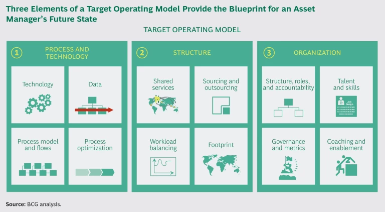 A target operating model, in BCG’s view, is a framework with three primary components: process and technology, structure, and organization. (See the exhibit “Three Elements of a Target Operating Model Provide the Blueprint for an Asset Manager’s Future State.”) These three elements provide a blueprint for an asset manager’s future state and translate into a series of business questions and decisions for front-, middle-, and back-office operations.