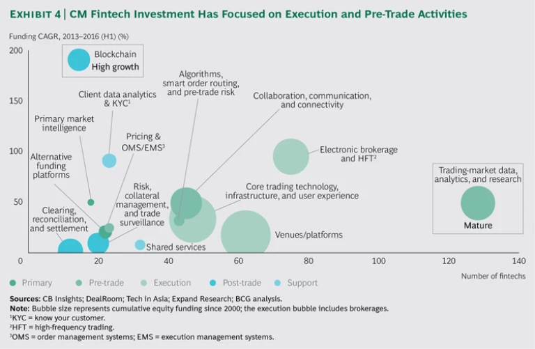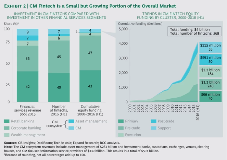 An Attractive Investment Opportunity. Indeed, despite perceptions to the contrary, the overall CM ecosystem has thrived in recent years, generating a sizable revenue pool that is expected to markedly increase over the next five years. (See Global Capital Markets 2016: The Value Migration, BCG report, May 2016.) Given the size and growth of the industry, as well as the less crowded landscape, the CM fintech space is an attractive market for both investors and entrepreneurs.