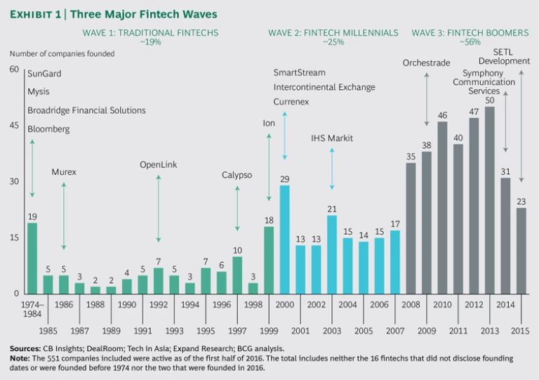 The second wave took place from 2000 to 2007 and comprised just under 140 fintechs that focused more on e-trading. These players included business disrupters, such as high-frequency trading, and execution platforms, such as Currenex.