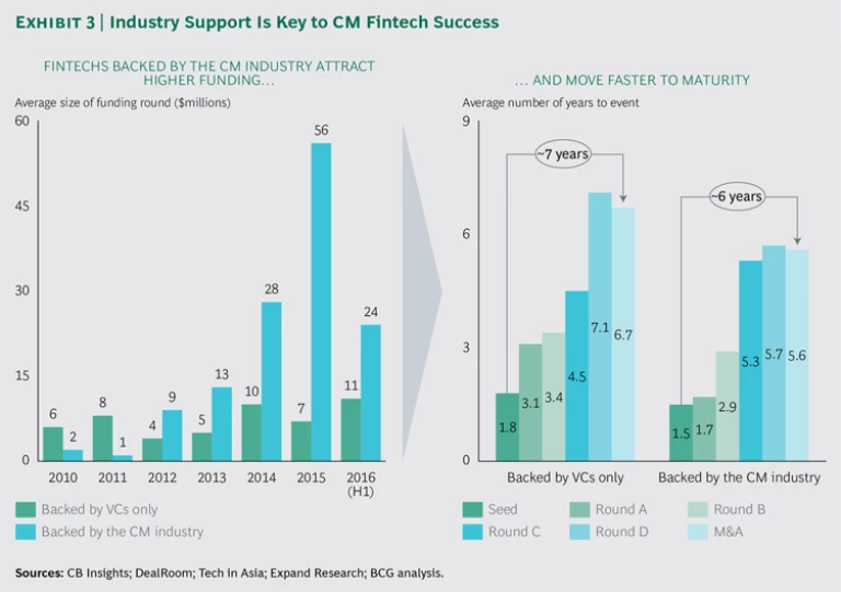 In addition, as we have seen, evidence shows that fintechs supported by banks or other strategic players, such as exchanges, tend to reach maturity faster and become more successful than those that are not backed by such players. (See Exhibit 3.) They also attract much greater funding, because VCs tend to follow strategic players in their investment allocations. The presence of such investors in fintechs signals that they are high-quality companies with credible business models and good prospects. On average, industry-backed fintechs reach the exit stage in six years, compared with seven years for firms backed only by VCs. Also, the average funding for industry-backed fintechs in the first half of 2016 was $24 million, compared with less than $11 million for those backed only by VCs.