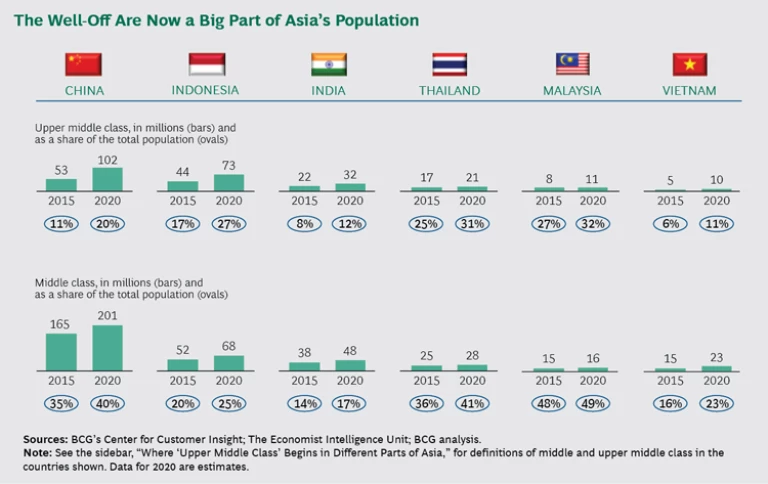 Companies looking for growth in slowing Asian economies should aim for the upper middle class. There are already about 150 million upper-middle-class consumers in the developing countries of Asia, accounting for more than $3 trillion in spending annually. Their number could easily swell by 100 million or more in the next few years.