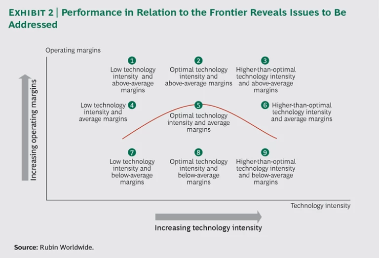 Optimize performance. A company should use its position along the technology economics frontier to help identify specific strategies for improvement. (See Exhibit 2.) Where your company falls in relation to the apex of the frontier will be within one of nine zones, each of which implies a strategic response.