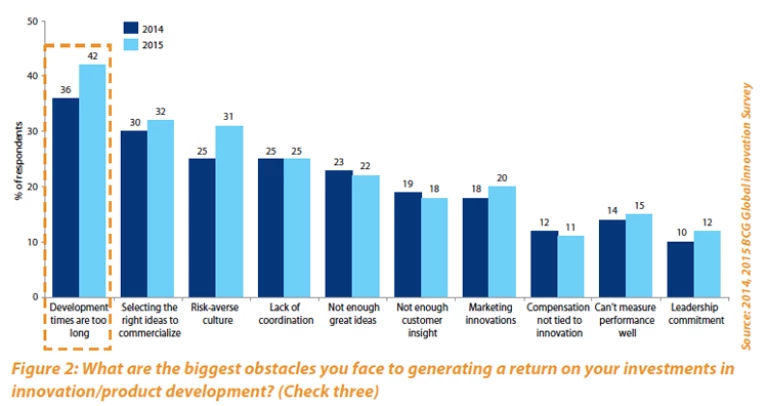 The right innovation management system can help shorten innovation development times for miners, mitigate risks, and ultimately improve returns on innovation investments. Indeed, BCG research shows that overly long development times are a key obstacle to generating desired ROI. (See Exhibit 2.)