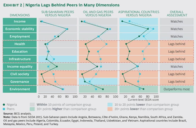 BCG's SEDA allows us to understand how Nigeria's economic performance affects the lives of the country's citizens. SEDA defines well-being through ten dimensions: income, economic stability, employment, health, education, infrastructure, income equality, civil society, governance, and environment. SEDA examines each dimension along two time frames: