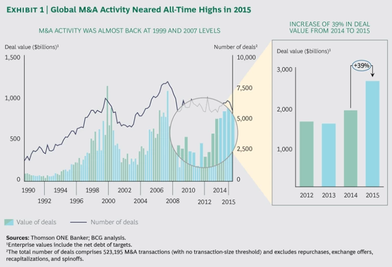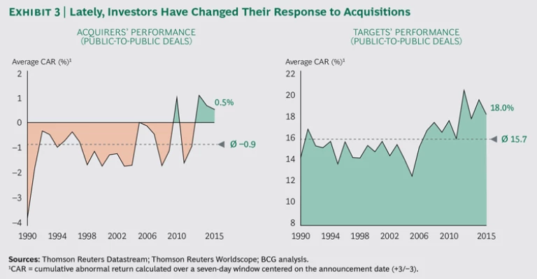 Following a strong 2014, the year 2015 will go into the books as a record for global M&A deal making. But in the long run, it may also be remembered as the year in which a sea change in investors’ appetite for deals became apparent. Capital markets have long greeted acquisition announcements with skepticism—and with good reason. Research, including our own, has consistently shown that most deals destroy value. But, as we explore in the following pages, markets in recent years have behaved differently than in the past and started bidding up shares of acquiring companies—by an average of 0.5% in the seven-day window around the announcement. In the current market environment, at least, investors are showing more trust in, and higher expectations for, dealmakers.