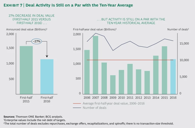 And, in fact, M&A value contracted in the first half of 2016 by more than 25% compared with the first half of 2015. That said, deal activity is at a par with ten-year historical averages, and the jury is still out on whether there are similarities to previous M&A market collapses. (See Exhibit 7.) The second quarter of 2016 saw a 14% uptick in activity from the first.