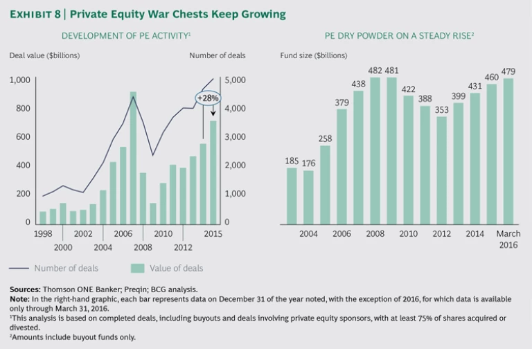 Going forward, we see two underlying factors supporting continued M&A activity. First, while PE buyers were highly active in 2015, their war chests also continued to grow, and they still face the need to put their money into play. (See Exhibit 8.)