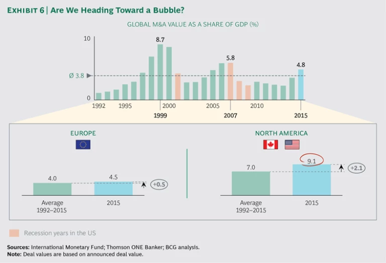 Taken together, the combination of trends and indicators in 2015 had the signs of a classic bubble preparing to burst. Global M&A value as a share of GDP had been rising steadily for the past three years and, at the end of 2015, stood at 4.8%—one full percentage point above its long-term historical average. Similar developments, albeit at even higher levels, were precursors of the technology bubble’s bursting in 2001 and the financial crisis of 2008. (See Exhibit 6.)
