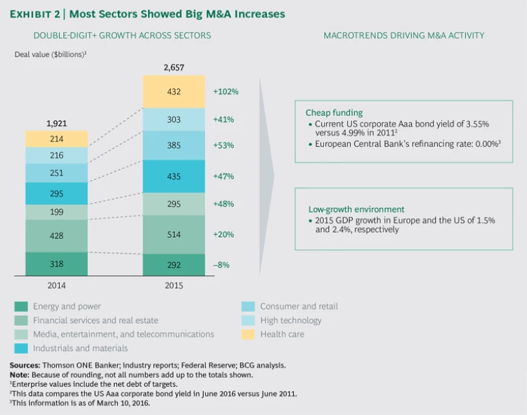 The continued low-growth environment in 2015—a 1.5% GDP increase in Europe and a 2.4% rise in the US, for example—contributed to the overall M&A boom, as did inexpensive funding (thanks to continued quantitative easing programs by central banks). In such circumstances, M&A has become a popular way for many companies to search for growth when organic growth opportunities are limited.