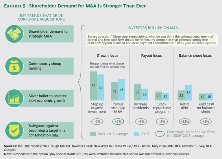 Second, investors are pushing corporate leaders to pursue strategic deals. (See Exhibit 9.) More investors than ever see strategic M&A as an attractive way to deploy capital in the current low-growth, cheap-funding environment (48% in our 2016 investor survey versus a 41% average among our 2009 through 2015 investor surveys). At the same time, in a clear sign of the times, fewer investors than ever prefer increasing investment in organic growth.