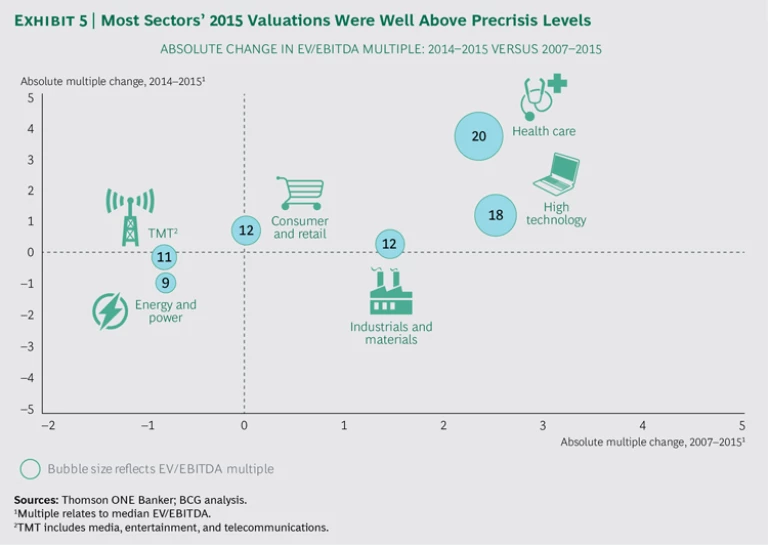 It’s important to note that the overall increase in valuation levels is not the result of a shift in M&A activity toward higher-multiple industries such as high technology. The 2015 valuation levels reflect a general upswing in numerous sectors. In fact, EV/EBITDA multiples in the majority of sectors climbed well beyond 2007 precrisis levels. (See Exhibit 5.) Median health care multiples, for example, ended 2015 at a record level of approximately 20 times EBITDA (3.7 points higher than 2014)—clear evidence of the significant synergy potential investors associate with large-scale mergers in this industry. The typical high-tech firm was acquired for 18 times EBITDA—up 1.2 points from the relatively high values in 2014 and 2.5 points over multiples in 2007. In 2015, a technology company with $500 million in EBITDA would have had an acquisition enterprise value $1.25 billion higher than in 2007.