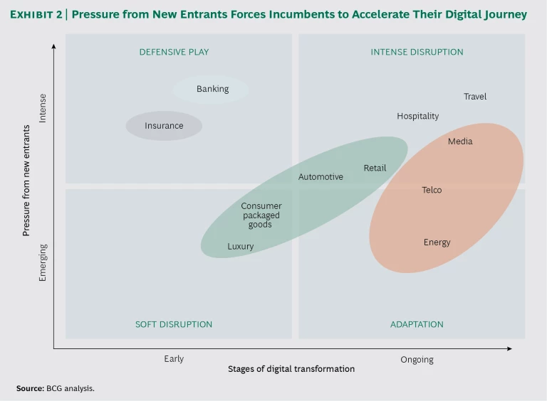 Every industry is impacted by digital, but companies’ approaches to it vary according to how much pressure they experience from new entrants and the extent to which digital is transforming their particular sector. (See Exhibit 2.) Some sectors, such as hospitality, retail, and travel, are already contending with intense competition from digital startups, many of which are flush with cash from venture capitalists. Others, such as banking and insurance, are playing defense because they are at least somewhat protected by legal barriers that make it hard for new entrants to gain traction, though banks are heavily under attack from financial technology companies, particularly in the area of payments. The luxury and consumer packaged goods (CPG) sectors are facing stiff competition from new entrants; without legal protections, these companies are being forced to adapt rapidly. In response, most incumbents now regularly scan the horizon for new technologies and patents to acquire attackers before they become too dangerous. Unilever’s $1 billion acquisition of Dollar Shave Club offers a striking example of this strategy in action.