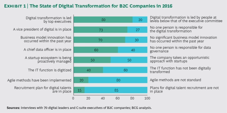The results are striking. With new attackers appearing all the time, digital transformation is seen by many as the only path to survival. But while many companies are restructuring their governance to become digital ready, there is still much to be done in terms of implementing agile at scale, capitalizing on open innovation, and hiring new digital talent. (See Exhibit 1.)