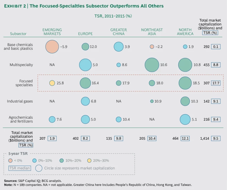 - Focused Specialties. This subsector, which consists of 55 companies, clearly outperformed the rest of the industry over the past five years, generating a median TSR of 17.7%, nearly twice the industry median. In fact, focused-specialty chemical companies outperformed all other subsectors in all regions. Of the eight clusters in this subsector, six were at the top of the TSR ranking, and only one was below the industry median.