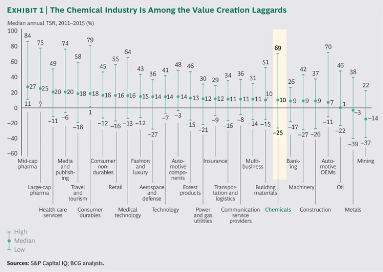 The chemical industry was once a top value creator, generating a five-year total shareholder return (TSR) above that of every other industry in BCG’s annual Value Creators ranking. Today, the industry is one of the more challenged. Its median TSR from 2011 through 2015 was 9.5%, considerably below the 12% median of the 28 industries we tracked. (See Exhibit 1.)