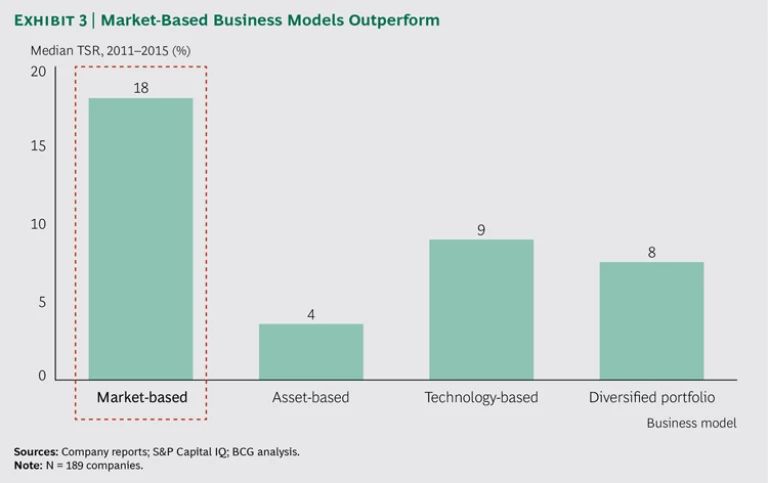- Market-Based Business Models. This category includes all companies that focus on competitive differentiation based on customized solutions, advantaged distribution channels, superior technical-service networks, agile supply chains, or faster innovation cycles. Companies that predominantly follow such business models had a median TSR of 18% from 2011 through 2015.