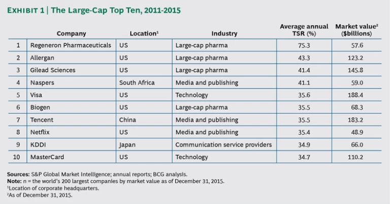 Another interesting finding in this year’s large-cap top-ten ranking is that five of the companies—Regeneron, Netflix, Visa, KDDI, and MasterCard—are all newcomers to the list. Meanwhile, three—Allergan (the successor to Actavis, which acquired Allergan in 2015), Naspers, and Biogen—are appearing in the top ten for the second time; and one, Gilead, for the third. The only company on this year’s list that has appeared in our large-cap ranking for more than three years is the Chinese social media powerhouse Tencent, which has made the top ten for six years, five of which were consecutive (2010 through 2014).
