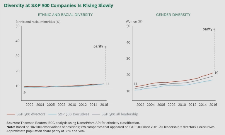 How often have you heard a CEO say, “I am happy with the diversity of our organization?” We have yet to meet such a CEO. Diversity in large organizations continues to be elusive, in spite of prolonged efforts and investments and the proliferation of diversity initiatives across companies. Only about 11% of senior leaders in S&P 500 companies hail from ethnic and racial minorities, up only 2% from 15 years ago and still quite far from 38%, the share of US adults representing ethnic and racial minorities.1 1 1. Using the NamePrism name-ethnicity classifier on a sample of 778 companies that were members of the S&P 500 from 2001 to 2016, we found that 11.2% of S&P 500 leaders in 2016 hailed from ethnic/racial minorities. In its Missing Pieces Report, the Alliance for Board Diversity found that 14.4% of Fortune 500 board seats in 2016 were held by people from ethnic/racial minorities.