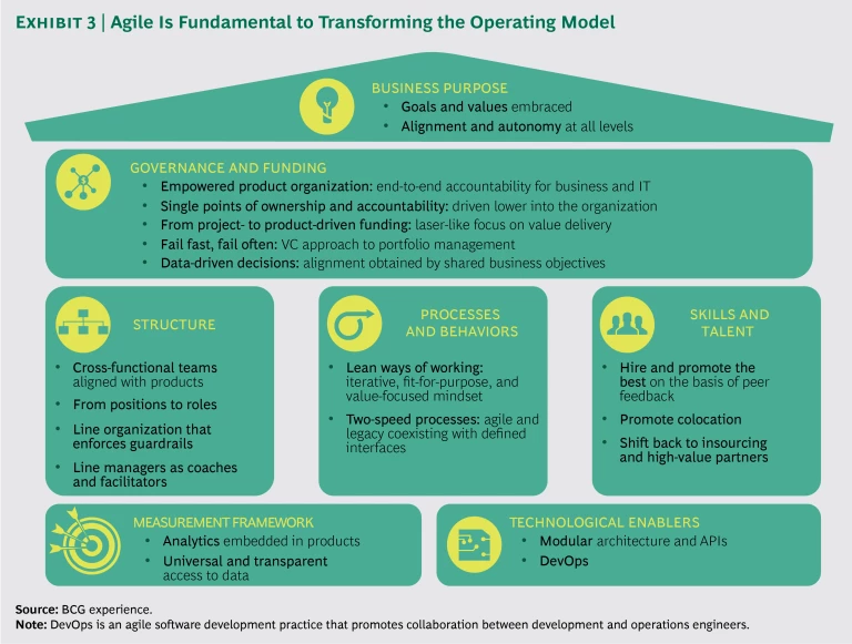 Most traditional companies have to build such capabilities, which require new ways of working and more agile processes to bring innovation quickly to market. (See Exhibit 3.) Siloed employees no longer perform discrete, predefined tasks in isolation. Instead, cross-disciplinary, colocated teams collaborate in innovative ways to enhance the customer experience. Working iteratively in short-term “sprints” and incorporating feedback to continually improve, agile teams across all functions have the potential to transform the business from the inside out. (See “Taking Agile Way Beyond Software,” BCG article, July 2017.)