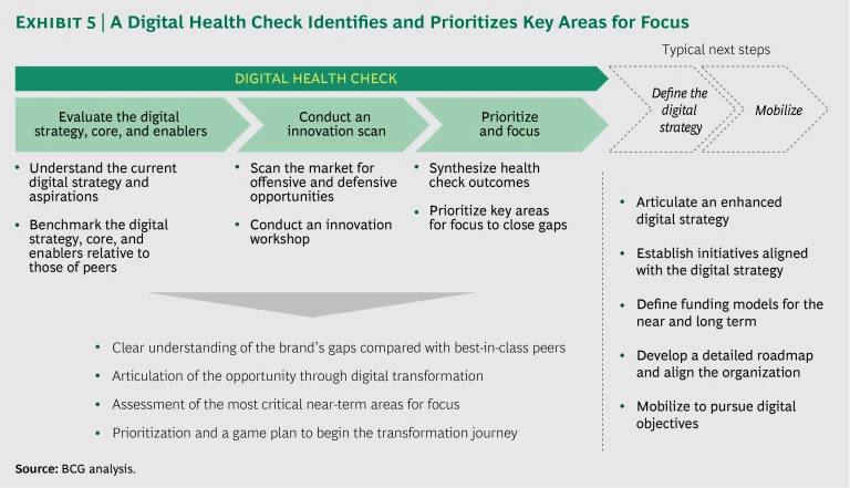In this context, it’s important for companies to cast a vision for the brand’s digital evolution in the medium to long term. Technologies—and business and operating models based on technologies—evolve. Flexibility should be a watchword. Companies must be careful that decisions made for near-term considerations do not lead to medium-term constraints or problems. They will also want to set themselves up for the long run with platforms and capabilities that allow for brand differentiation. Tools—for example, a digital health check—can provide clear perspectives on how the brand stacks up digitally compared with peers and can expose the critical gaps. (See Exhibit 5.)
