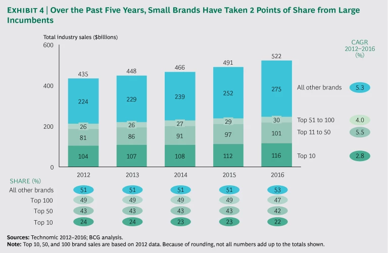 Scale advantage does not guarantee victory, however. In the digital environment, fast-moving digital insurgents can restructure the value chain, needing far less time and money than traditional companies to build digitally advanced brands. Over the past five years, small restaurant brands have taken two points of restaurant industry share while the largest brands have given up share. (See Exhibit 4.) Other startups with new models, offerings, and value propositions are doubtless just over the horizon.