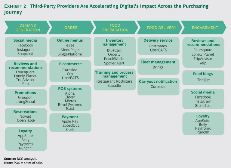 While the high costs of digital innovation have, in the past, made it the preserve of larger brands, the rising speed and falling costs of technology development are bringing many third-party players to the table and enabling small brands to get into the game. Across the value chain, third parties are putting digital innovations into the hands of brands that may lack the scale to make their own large investments. (See Exhibit 2.) Digitally enabled deliveries are the source of up to 10% of the sales at Mendocino Farms, a regional restaurant chain in southern California. Olo, a mobile ordering platform, provides white-label e-commerce solutions for brands with 40 locations or more. Under a recently announced partnership with Amazon, Olo’s restaurant clients will be listed in the Amazon Restaurants delivery section of Amazon.com.