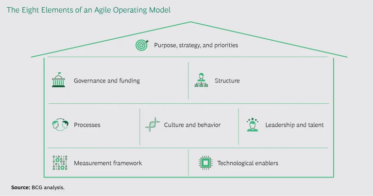 Leaders have different roles. Agile organizations still maintain management layers above agile teams, but leadership takes a different form. Leaders establish context and strategy, allocate resources, and remove roadblocks. But what leaders do not do is equally important: they don’t get involved in the day-to-day work and instead leave decisions about execution to the teams. In other words, leaders define team objectives and how they will be measured, but they let the teams decide how best to meet those objectives. (See “Agile Starts—or Stops—at the Top,” BCG article, May 2018.)