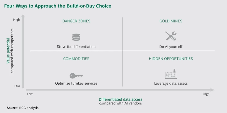 The analysis outlined here should help companies become more efficient and effective in structuring and sourcing AI applications and capabilities. Decisions such as whether to build or buy an AI product or service are too important to be approached haphazardly, but uncertainties should not stand in the way of progress. Companies should make decisions within the context of a coherent data strategy, the pursuit of competitive advantage, and a recognition that boundaries will continually shift over time. Areas of competitive differentiation will evolve, and data pools that are distinctive today may lose their value as data continues to proliferate. In this dynamic environment, acting systematically, intelligently, and decisively will itself help secure the future.