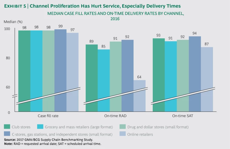 Exhibit 5 may reflect future, as much as past, performance. As the number of alternative channels (such as convenience and drug stores) and e-commerce channels grows, service performance becomes trickier. Order requirements vary greatly from channel to channel and from customer to customer. CPG companies can no longer count on economies of scale achieved through a one-size-fits-all approach to their customers.