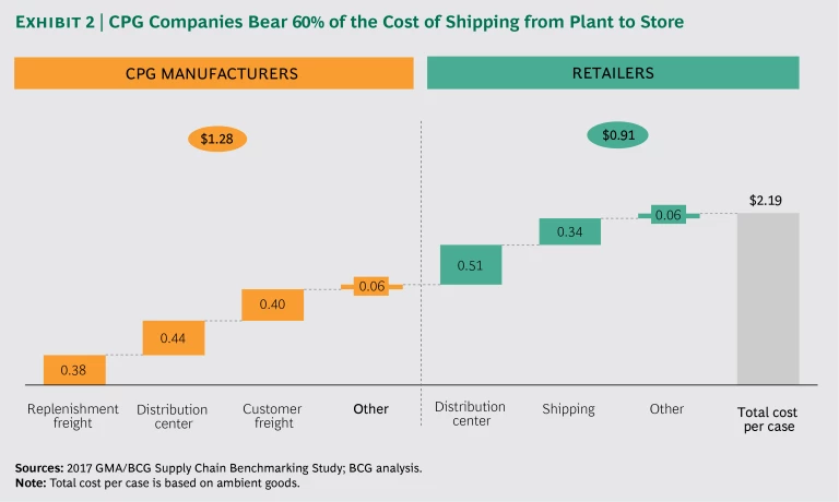Achieving high service levels while keeping costs low is a perpetual challenge, yet the need to do so is only growing. Retailers are feeling the effects of tectonic shifts in the industry—notably, the rise of e-commerce. To stay competitive, they will continue to press for better prices and better service levels from their CPG providers. Already, CPG companies carry 60% of the cost of logistics and hold roughly 50% of inventory. (See Exhibit 2.) And that burden may well grow.
