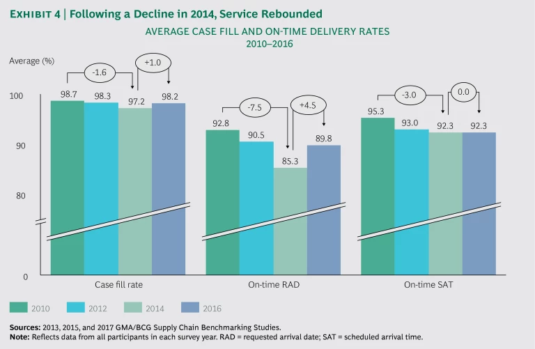 Since our previous study, service performance went from troubled to favorable (at least on an absolute basis), rebounding overall to 2012 levels. The average case fill rate rose 1 percentage point, to 98.2%, and average on-time delivery (requested arrival date, or RAD) rose 4.5 percentage points, to 89.8%. (See Exhibit 4.) This development is good news indeed, considering that in an industry starved for growth, any service woes can easily become a flash point for lost sales.