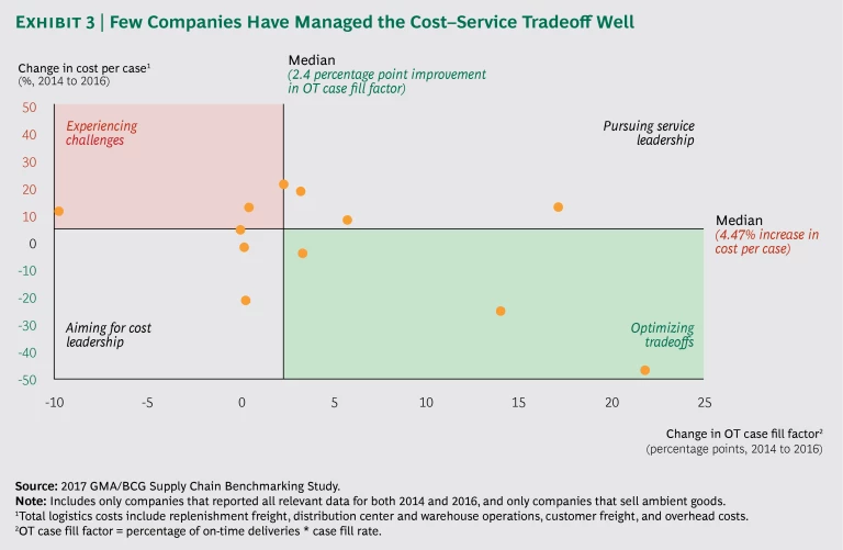 Some companies have managed the cost–service tradeoff more deftly than others. (See Exhibit 3.) Among respondents who also participated in the 2015 survey, the median on-time case fill factor was 89.7%—a 2.4 percentage point improvement. But the median cost per case ($1.58) represented a 4.47% increase. (Cost per case includes replenishment freight, distribution center and warehouse operations, customer freight, and overhead.) Only three companies succeeded in improving service and reducing costs.
