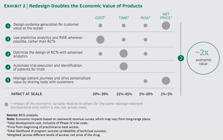 Proof points already exist for each of the five elements of the redesign. Implementing them together at scale will double the economic value of a pharmaceutical company’s products. (See Exhibit 2.) This is owing to a combination of four factors: lower cost of evidence generation, lower risk, faster time to best access (increasing the launch-to-loss-of-exclusivity window), and better net price (inclusive of rebates, copay assistance, and access). The redesign ultimately puts companies on a new S curve, allowing them to more readily translate ongoing digital and analytics experimentation into bottom-line impact (as opposed to just adding new costs, as is often the case with such investments today).