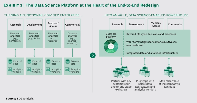 Elevate data science culture and capabilities into a business platform. It’s time for pharma to shift away from its traditional regulatory-driven caution to the proactive use of integrated insights (around patient, practice, and disease) in all decision making throughout the product life cycle. Companies must pivot away from siloed data and analytics and embrace a cross-functional business platform. This requires several changes to the existing model: