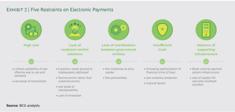 Digital is an attractive alternative where the cost of cash is high (transport, ATM servicing, security, labor), where technology uptake is accelerating, or where the government struggles to collect sales tax. Numerous countries meet one or more of these criteria, according to an analysis in Harvard Business Review. They include developed markets such as France, Belgium, Spain, and Germany. Still, barriers to uptake remain. We have identified five principal areas of resistance. (See Exhibit 2.)