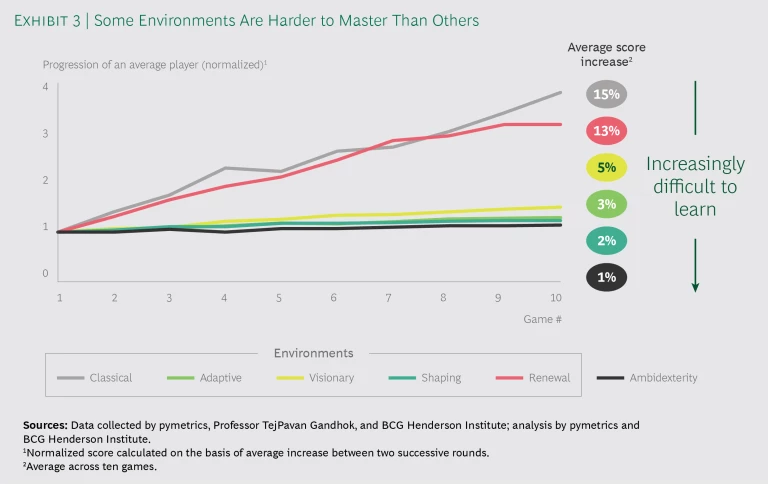 We found that all approaches can be learned, but at very different rates. (See Exhibit 3.) The strategy skills required to succeed in Classical and Renewal environments were learned relatively quickly: In those environments, players’ scores increased by an average of 15% and 13%, respectively, in their first ten games. In contrast, the skills required to succeed in Visionary, Adaptive, and Shaping environments were much more challenging to improve through practice. Mastering Ambidexterity was the most challenging, with an average learning rate of roughly 1% during the first ten games played in each environment.
