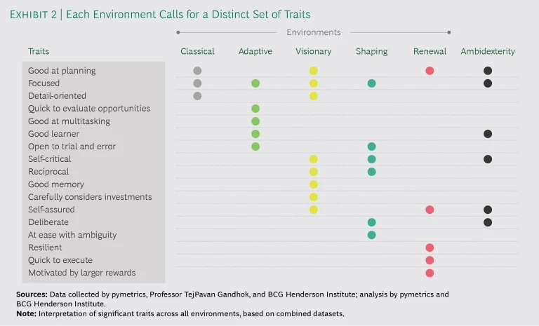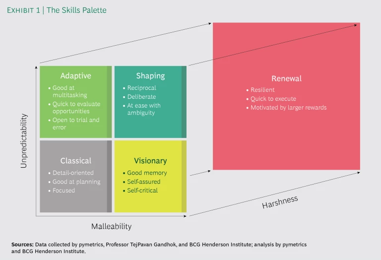 Together, these sets of traits demonstrate the skills palette that businesses need to paint with in order to set and execute strategy effectively. (See Exhibit 1.) The optimal skills for strategists vary significantly across each environment.