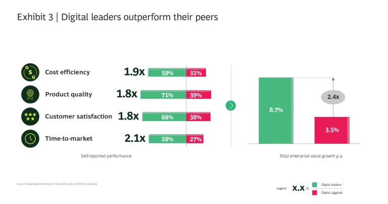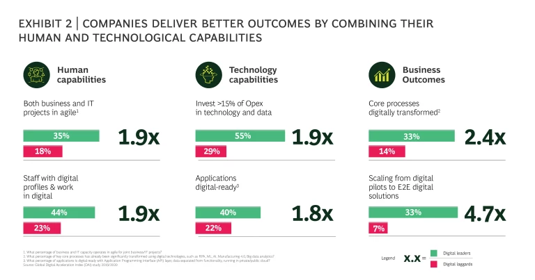Our research shows that companies that invest in combining these capabilities outperform their competitors overall, and on dimensions such as efficiency, product quality, customer satisfaction and speed to market (see Exhibit 3).